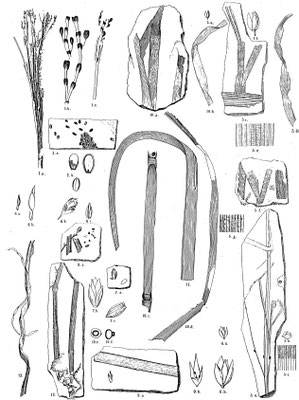 Der Johanni-Stollen lieferte die meisten und am besten erhaltenen Pflanzenfossilien. Gelegentlich der Bewältigung eines Verbruches daselbst im Jahre 1868 stiess Herr Bergdirector Radimsky auf eine Schichte feinkörnigen blassgclbcn Schieferthons, welche mit Pflanzenabdrlicken vollständig erfüllt war; so wurde diese wichtige Fundstelle von Fossilien der Wissenschaft aufgeschlossen und ich veranlasst, den ganzen Sommer von 1870 und 1871 auf eigene Kosten in der Gegend zuzubringen. Eine verlassene geräumige Hütte in der Nähe des Stollens schlitzte mich vor Unbilden der Witterung; die pctrcfactenhältigen Schiefer wurden in die Hütte gebracht und von mir vom frühen Morgen bis späten Abend durchsucht. Die Ausbeute war selbstverständlich eine ausserordentlich grosse. Nur die von Eisenoxyd gelblich gefärbten Stellen der Schichten haben sich als sehr reichhaltig, hingegen die grauweissen und grauen Schiefer als arm oder leer au Fossilien erwiesen. Diese Erfahrung ergab ein vorzügliches Lcitmittel, um schnell und sicher zum Ziele, der Gewinnung der fossilen Flora, zu gelangen. In den folgenden Jahren besuchte ich noch oftmals diese Lagerstätte und erst vor wenigen Jahren erhielt ich ganze Waggonladungcn voll mit dem gelblichen Gesteinsmaterial als letztes Vorkommen desselben nach Graz gesendet. Der Stollen ist nun gänzlich verfallen und die baufällige Hütte abgetragen. (...)