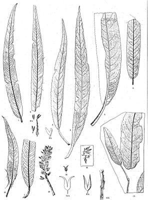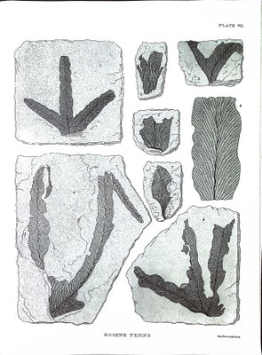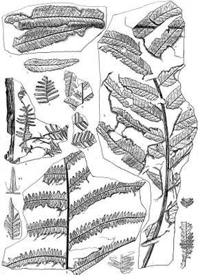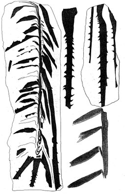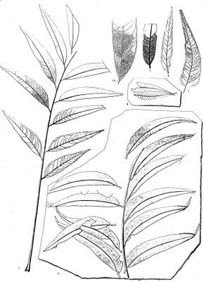 immer am breitesten ist». Die Diagnose der anderen Art (Fig. 3) lautet bei Fries folgendermassen: »Filix. .. fronde longissima, incisoserrata, determinate striata, serraturis latis, aequalibus, inferioribus obtusis, superioribus acutis». Namen werden den Resten nicht beigelegt, Fries sagt nur, dass diese Filices den tropischen Asplenien am nächsten kommen dürften.