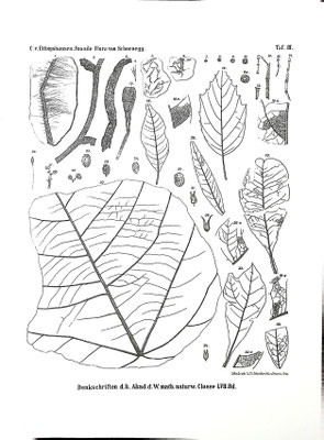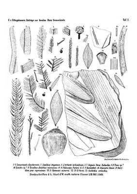 Seit dem Jahre 1868 ist die fossile Flora von Leoben Gegenstand meiner besonderen Aufmerksamkeit. Im Jahre 1869 veröffentlichte ich meine Untersuchungen der fossilen Pflanzen vom Moskenberg (Sitzungsber., Bd. LX, Abtb. I). Die im selben Jahre an den übrigen Fundstellen des Braunkohlenbeckens von Leoben, nämlich am Münzenberg, beim Unterbuch-wieser und am Walpurgis-Schacht im Seegraben gemachte reiche Ausbeute ist zwar schon von mir bearbeitet, es ist jedoch hierüber bis jetzt nichts publicirt worden. Dazu kamen noch weitere Nachforschungen an der erstgenannten Lagerstätte und am Münzenberg, veranlasst durch die gefällige Vermittlung des Herrn Bergverwalters Rachoy und des Herrn Adolf Hofmann in Leoben. Die fossilienhältigcn Schiefer wurden meistens erst in meinem Laboratorium unter-sucht und die Pflanzeneinschlüsse derselben nach meiner Methode zu Tage gefördert. So konnte ein ausgezeichnetes Material dieser fossilen Flora gewonnen werden. Meine bis zum Jahre 1878 zu Stande gebrachte Sammlung ist in das Eigenthum des k. k. Naturhistorischen Hofmuseums in Wien übergegangen und wird in der geologisch-paläontologischen Abtheilung daselbst aubfewahrt. Meine späteren Acquisitionen befinden sich derzeit im phyto-paläontologischen Institute der Universität Graz.