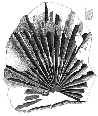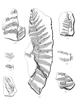 Für unseren jetzigen Zweck .ist die letzte Mitteilung allein von Interesse, denn hier wurden zum ersten Mal Reste abgebildet (3, Taf. 4, Fig. 2, 3), die später als zwei verschiedene Arten einer neuen Pflanzengattung beschrieben wurden. Fries sah beide als sicher den Filices angehörig an. Die eine Art (Fig. 2) wurde auf folgende Weise beschrieben: »Filix . . . fronde pinnata, pinnis confertis, discretis, linearifalcatis, determinate striatis» wozu noch bemerkt wird, dass die Streifen (striae) 6, 9 oder 12 sind, »von welchen jeder dritte